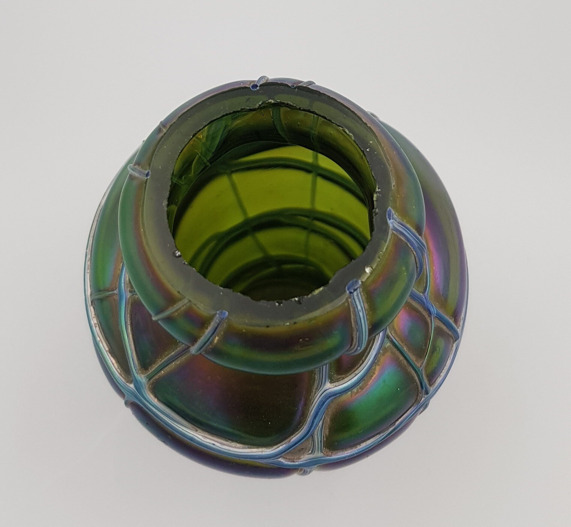 During the Art Nouveau period, this glass company produced high quality iridized glass. Hot glass trails were wound around the iridized glass forming a network, and the piece was then blown into a mold so that the trails were pressed into the glass.