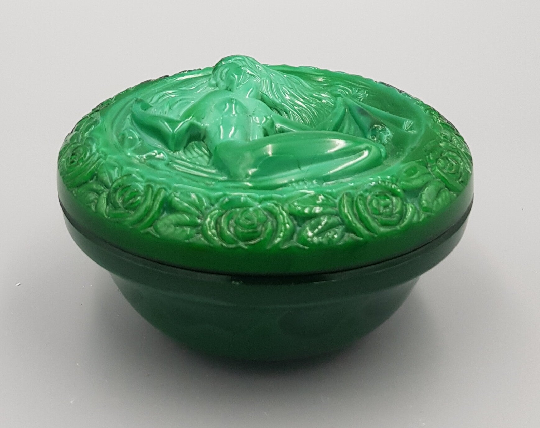 Lidded Art Déco jade "Ingrid" glass bowl with female nude, Curt Schlevogt, Gablonz, Bohemia
