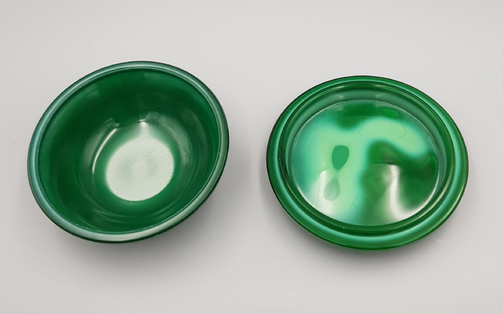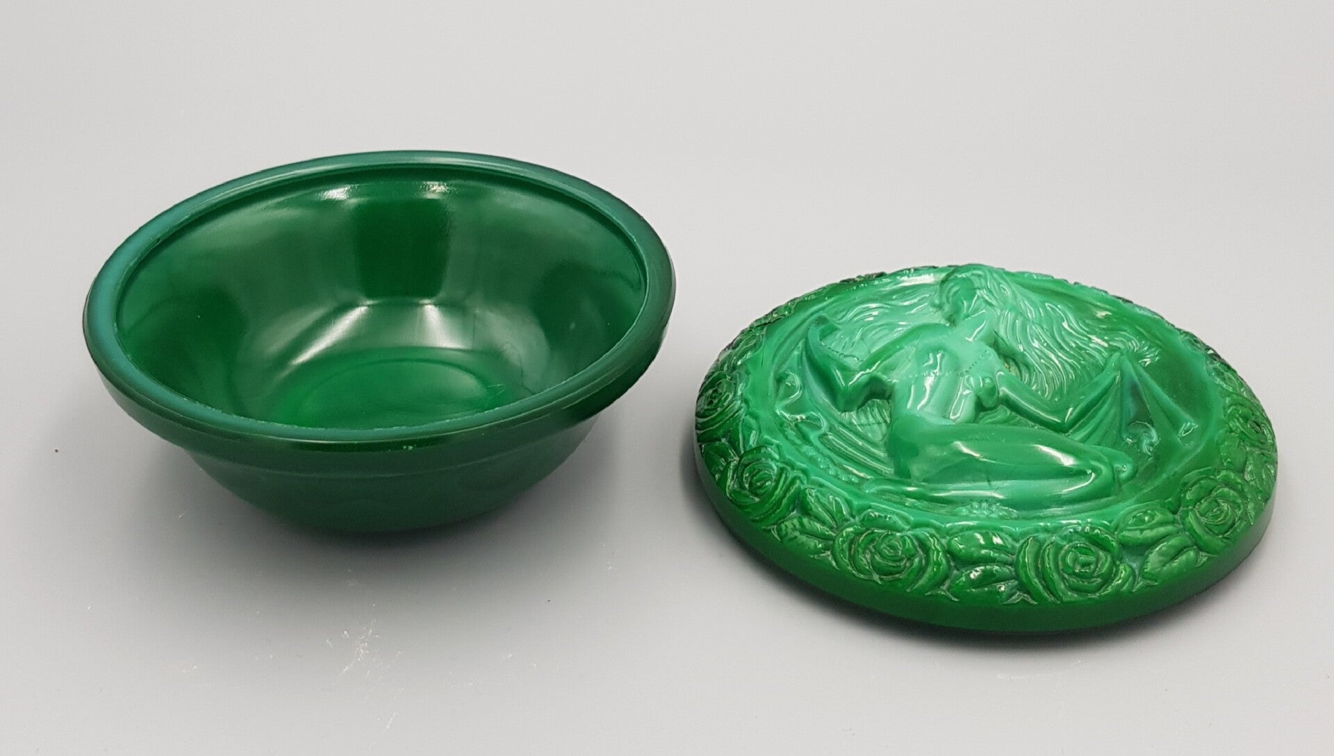 Lidded Art Déco jade glass bowl with female nude, Curt Schlevogt, Gablonz