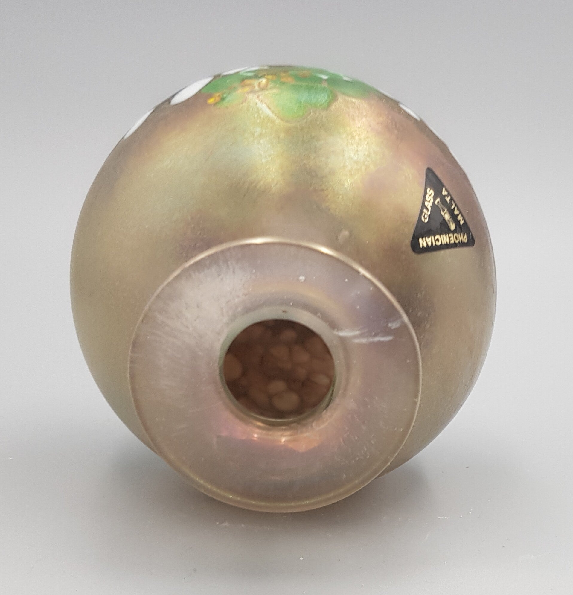 This beautiful mouth-blown glass vase by Malta Phoenician is a real eye-catcher. The vase has a beautiful colouration, green speckles and an iridescent finish. It is designed in the style of classic Art Nouveau vases. The vase has a spherical shape with a narrow neck and flared opening. The bottom is also polished and signed Malta Phoenician.